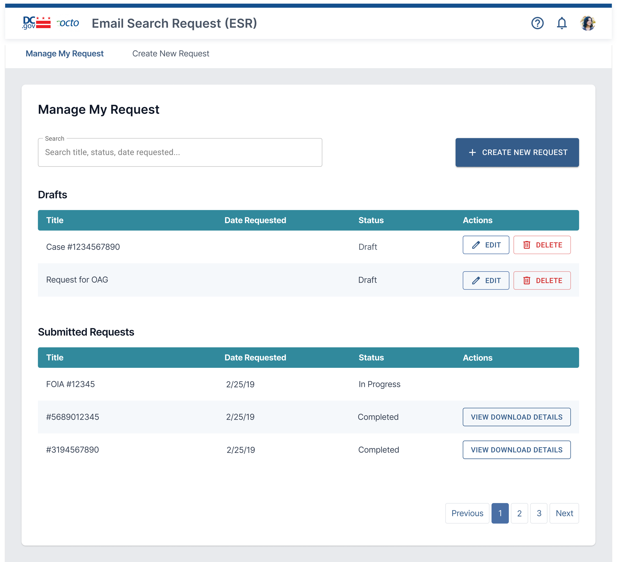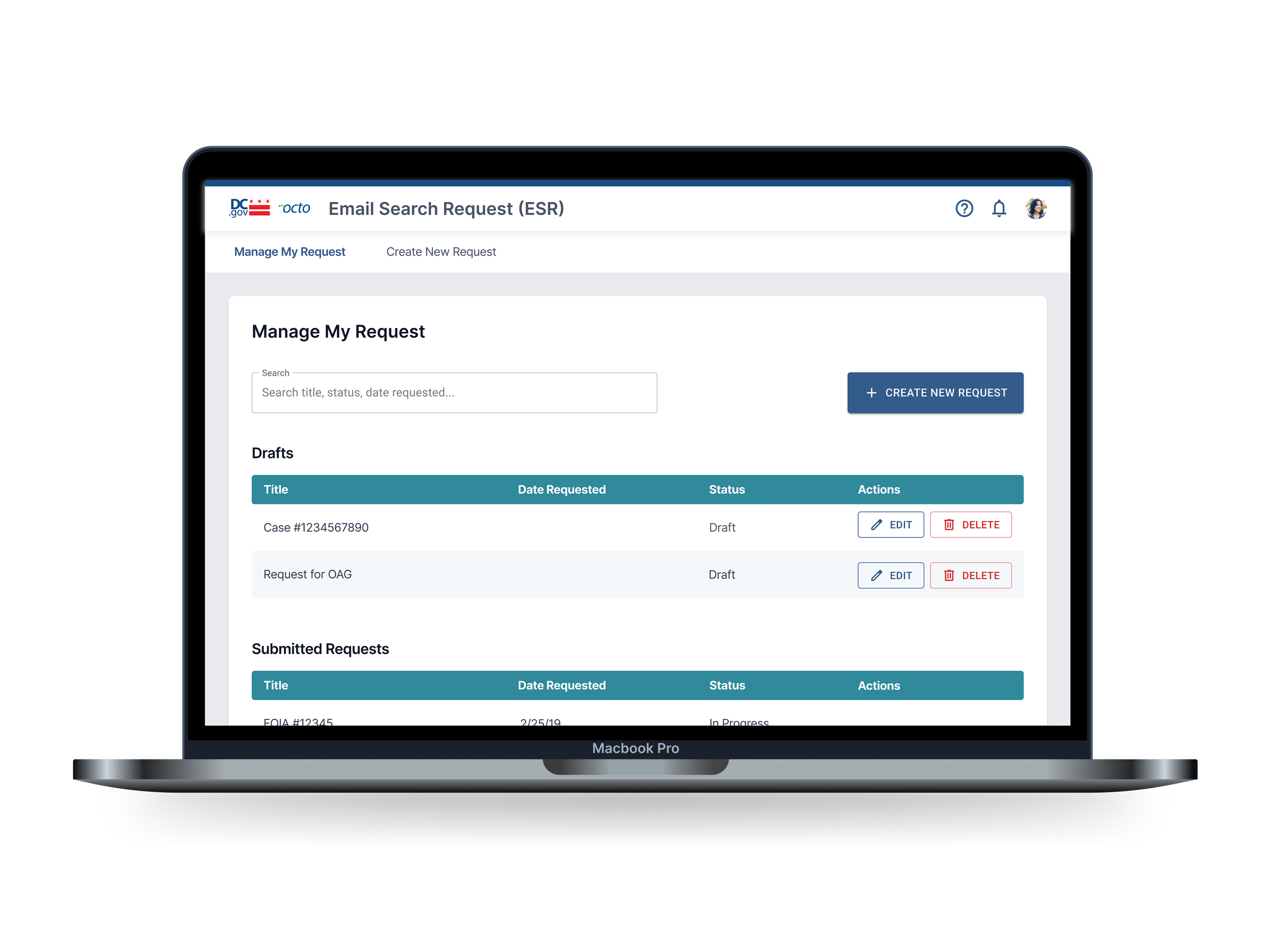 The current Email Search Request (ESR) system has limited search functionality and provides users with minimum visibility about the status of their requests. This causes users to spend additional time managing their requests and communicating directly with staff, increasing administrative burden.